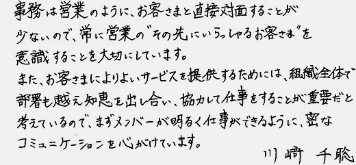 「地域支援銀行」としての社会的意義の高さに魅力を感じて入行を決めた。また、日本経済の中心である東京から、更には中小企業を中心として経済を元気にすることで、全国的な経済活動活性化への一翼を担える可能性にも惹かれた。本店業務部を経て、2015年より現職。