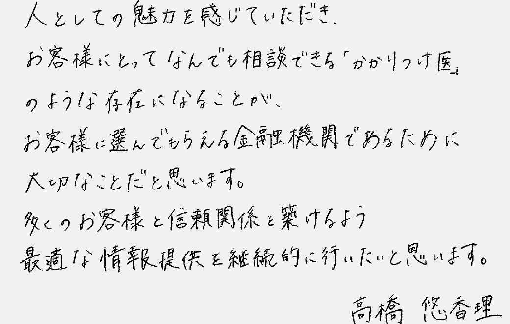 資産コンサルタントの仕事は、リアルタイムで相場が動く金融商品を扱うため、知識を磨く研修を受けたり、報道される金融専門家の発言に注意を払ったりしていますが、何より大切なのは、お客さまの真のニーズはどこにあるのかを探ることです。そのためには、コミュニケーションを大切にしなければなりません。前任者から引き継いだ60代の女性のお客さまで、当行で以前、投資信託を購入された方がいらっしゃいました。運用でマイナスが出ていたため、私はお客さまに対して何かを提案するのではなく、コミュニケーションを深めることを優先しました。信頼関係が深まった段階で、キャンペーンで金利上乗せができる外貨預金を提案、プラスで解約いただくことができました。その後、リスクを分散した投資信託、ファンドラップ、定期預金などを組み合わせて提案、数千万円を運用させていただいています。プライベートな事もお話しいただけるほど関係も深まり、営業担当者冥利に尽きると思っています。